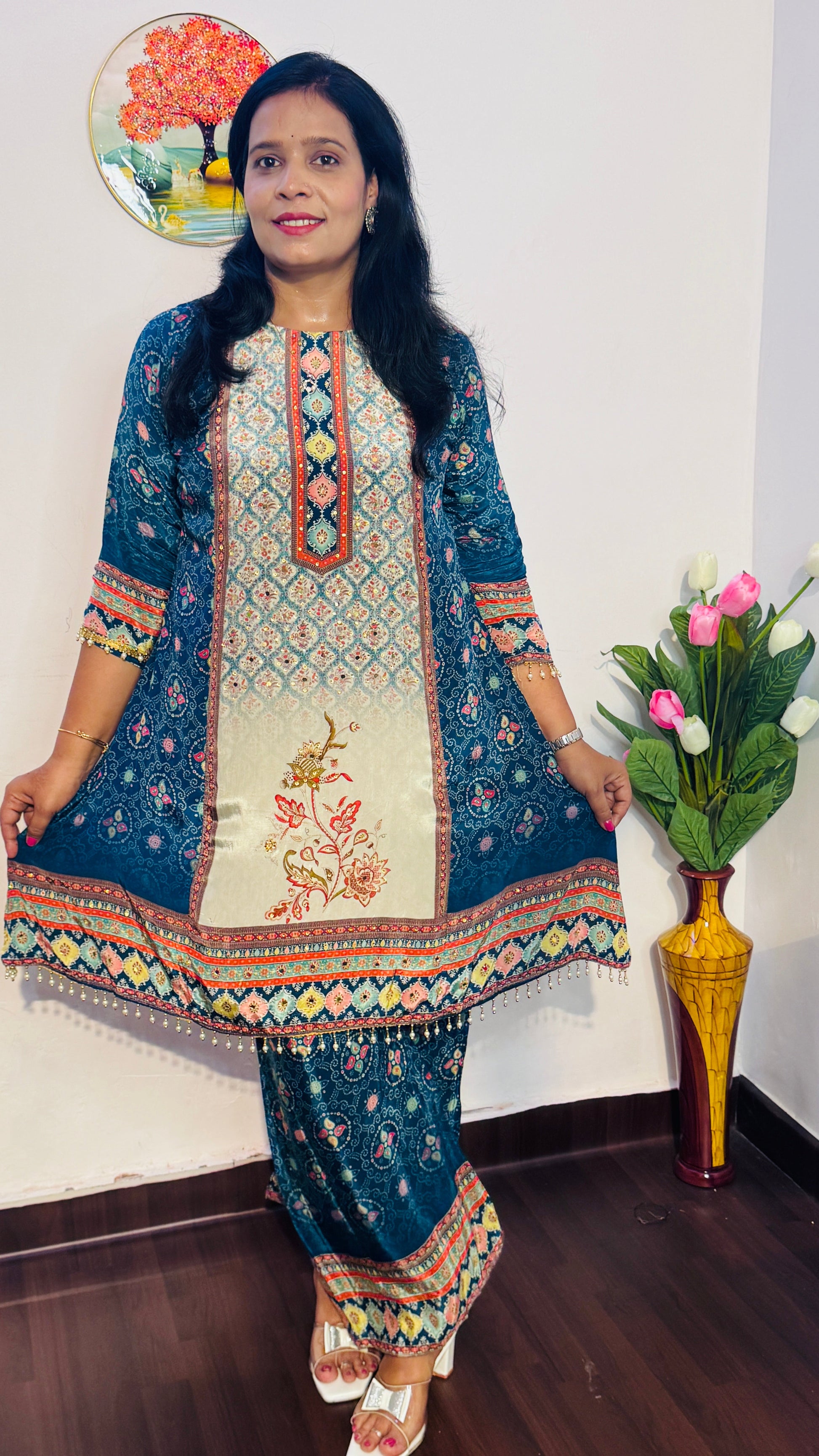EMBROIDERED NATURAL CREPE BLUE PALAZZO SUIT SET