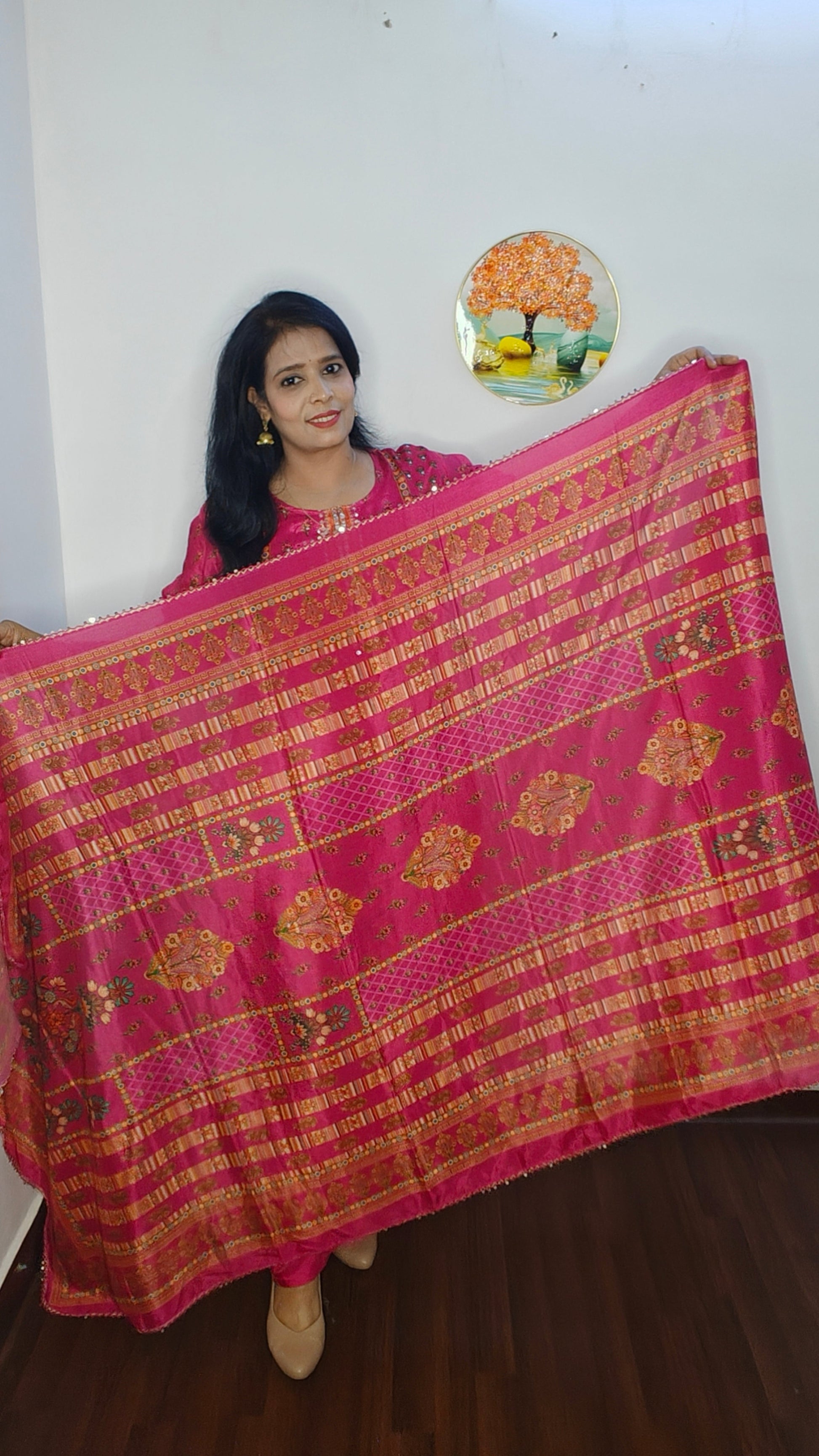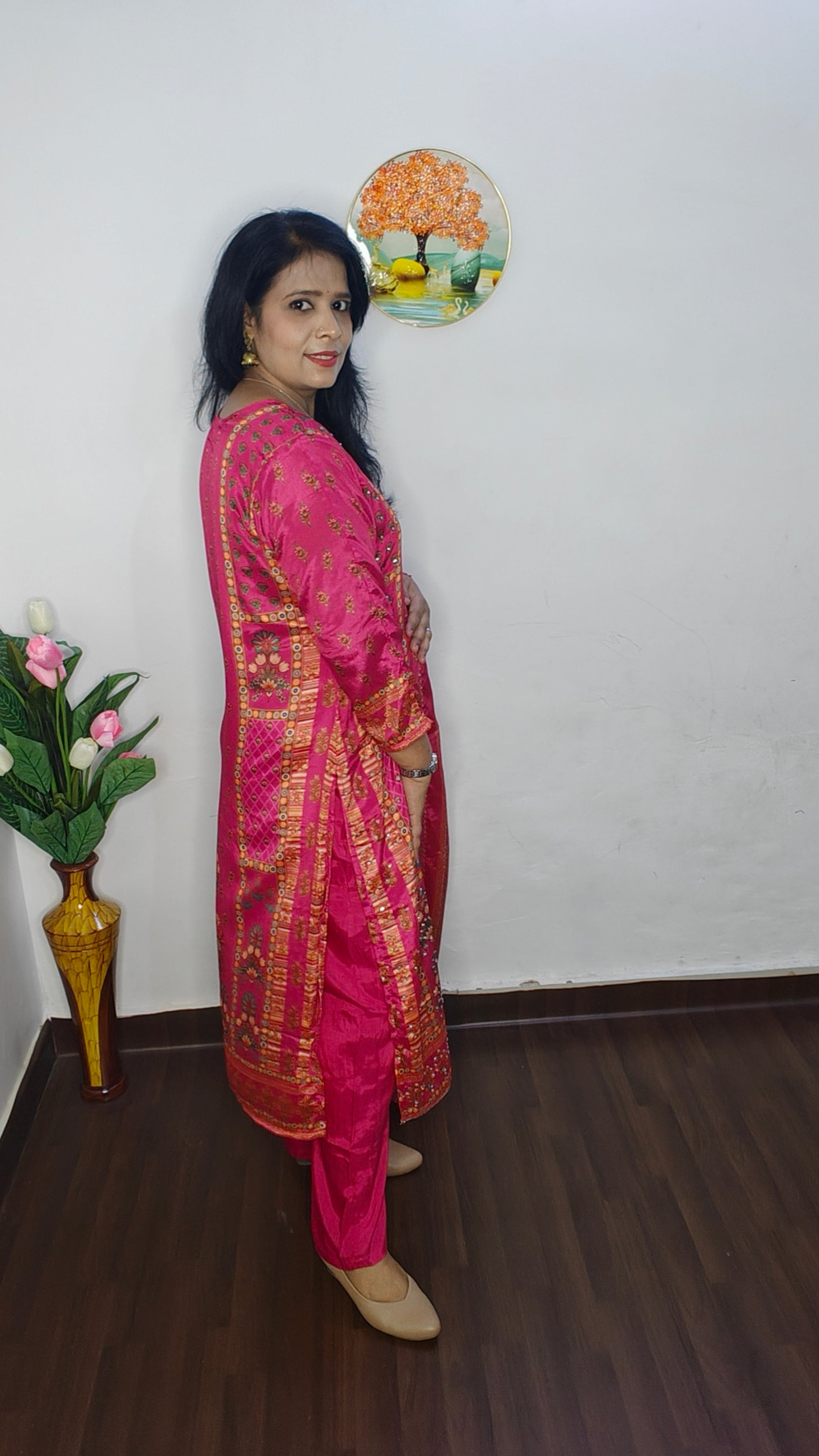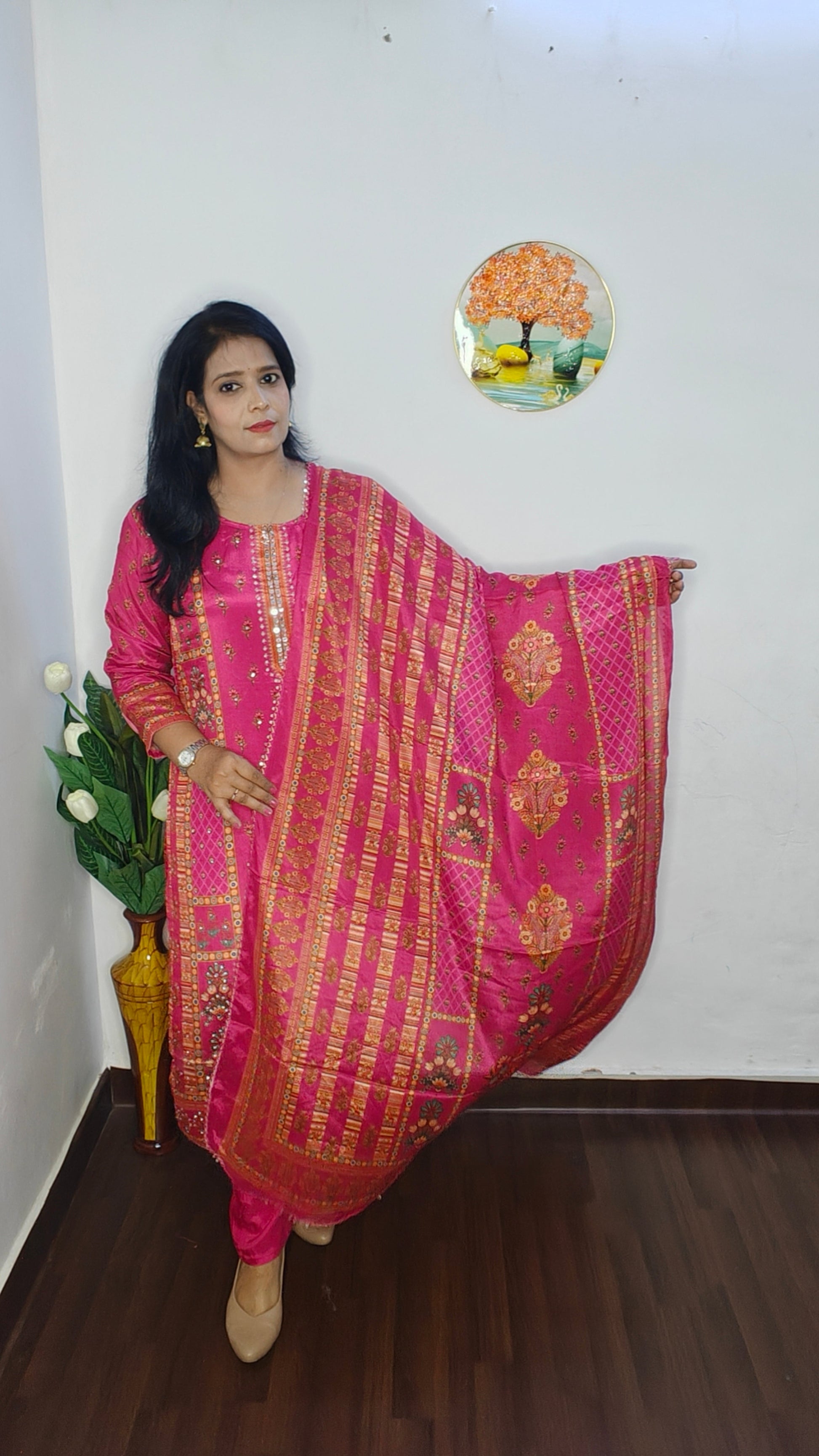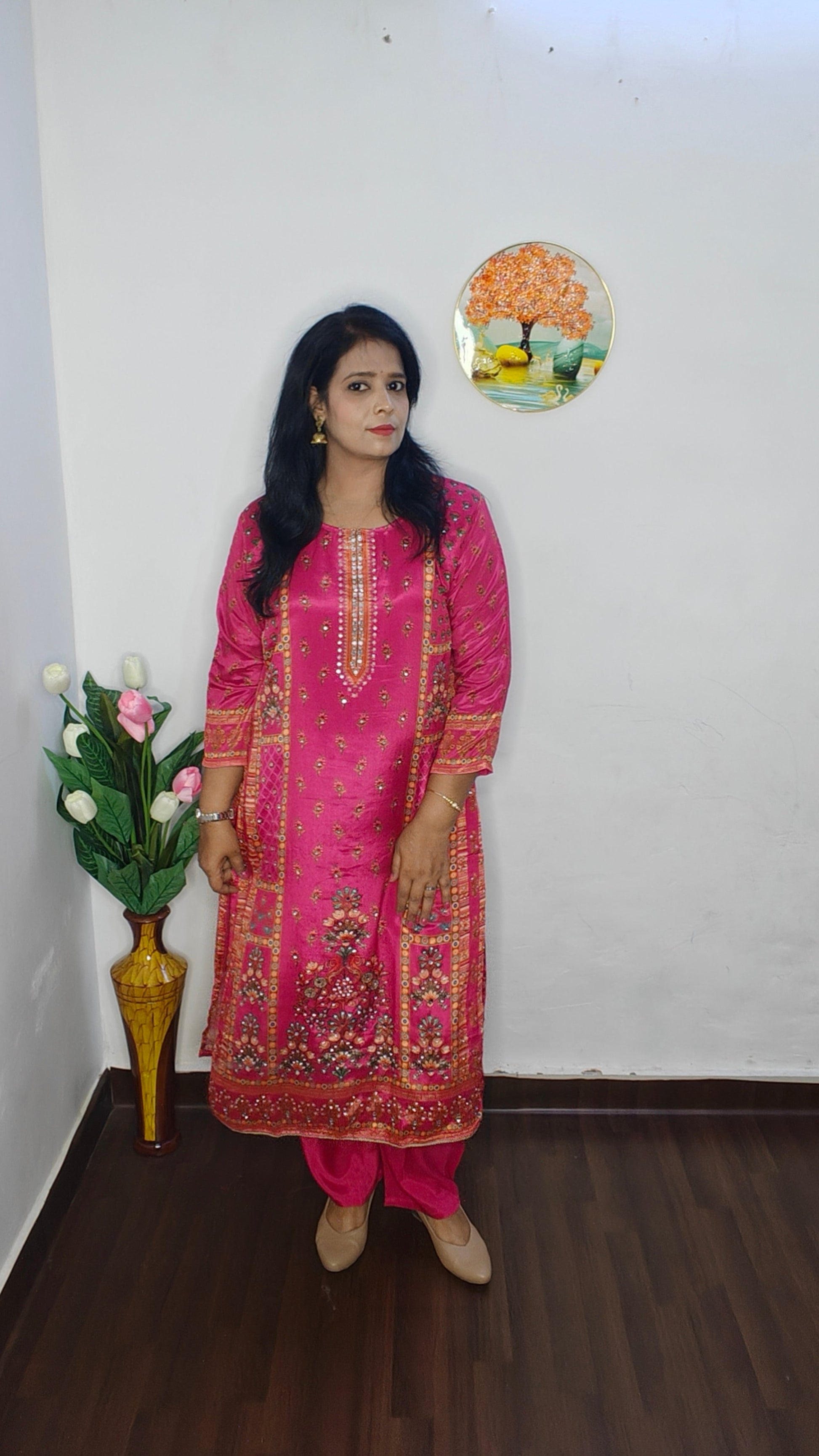 HOT PINK CHINON GOLDEN SEQUIN WITH MIRROR WORK SUIT SET