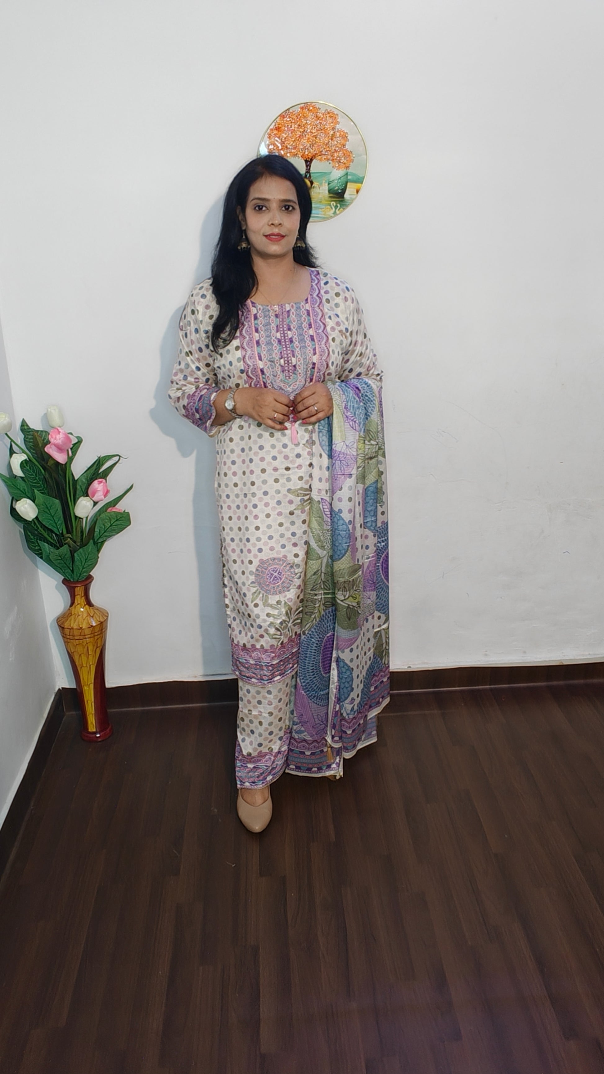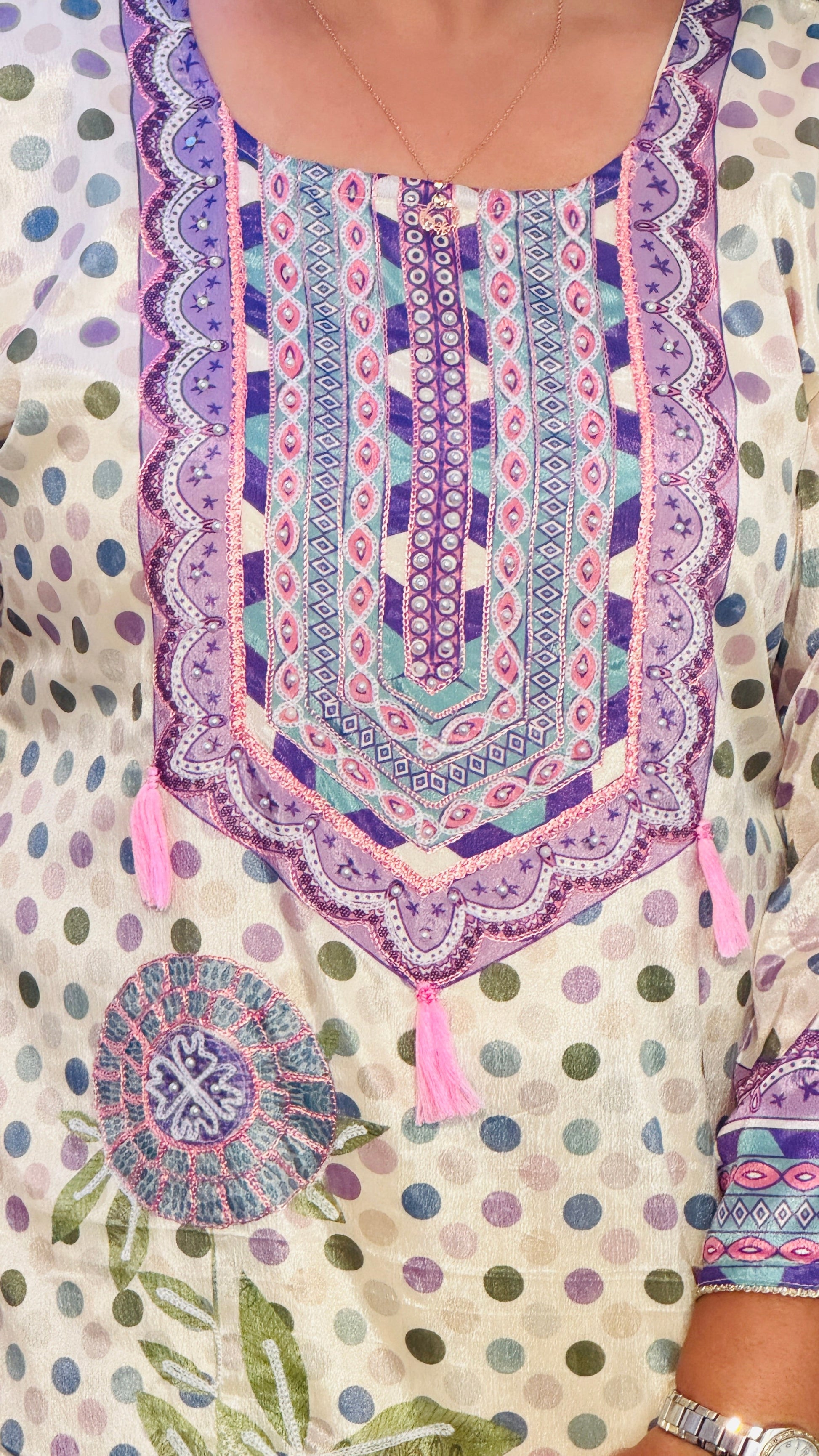 Intricate floral and polka digital print enhances the overall appeal.