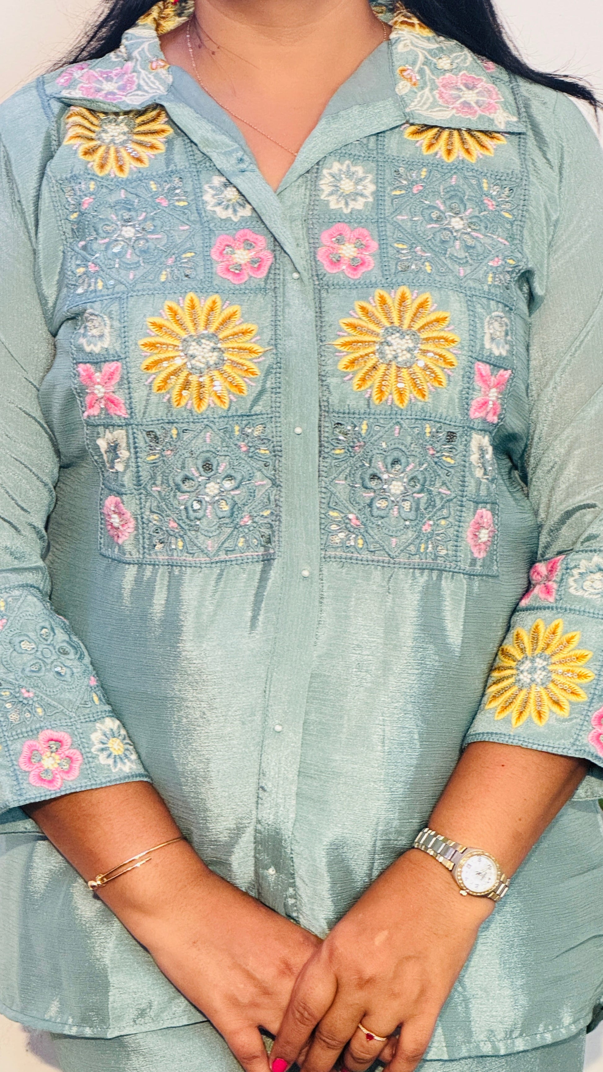 CHINON PISTA GREEN SHIRT FULL EMBROIDERED CO-ORDS SET
