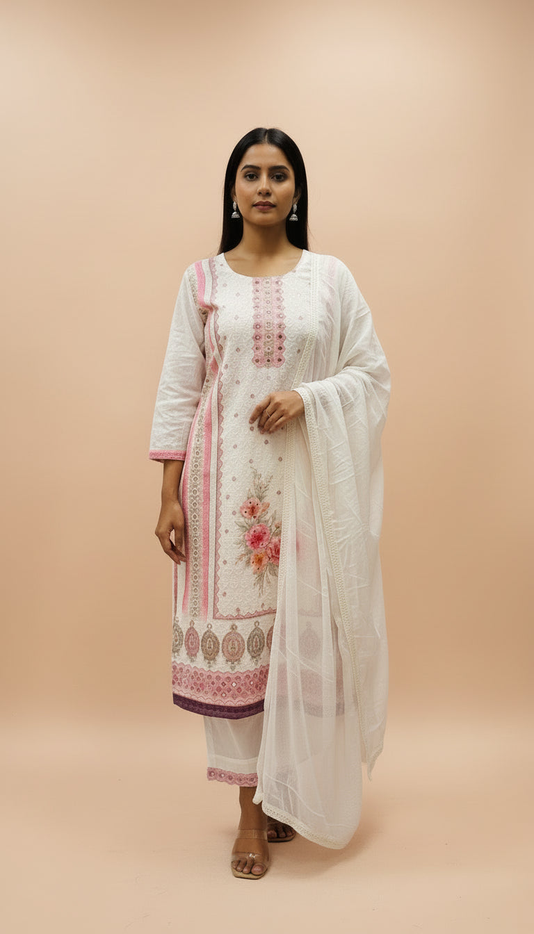 WHITE & WINE PINK COTTON SIFLY SUIT SET WITH BEADS WORK |BHAVIAURA